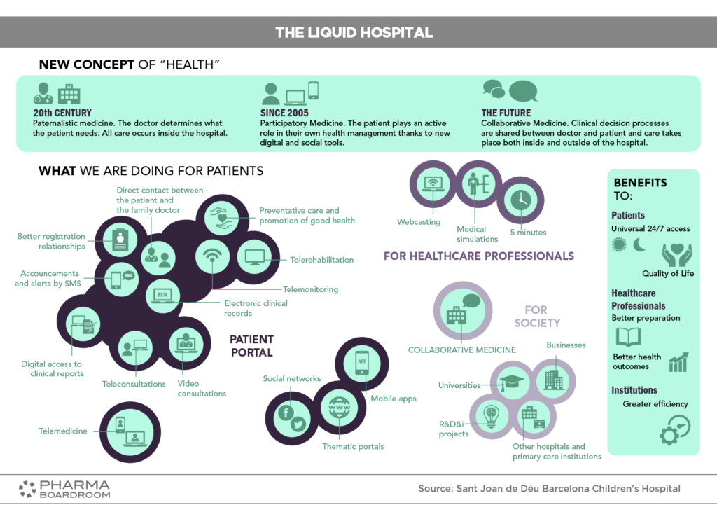 Spanish stakeholders have been trailblazing the concept of the “liquid hospital”, which envisions the virtual and physical expansion of healthcare provision beyond the parameters of the traditional centralized hospital structure. The aim is to leverage connectivity, telemedicine, the Internet of Things (IoT) along with social media to co-opt patients, families and society into the management of disease.