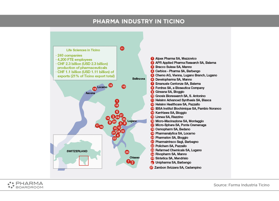 “Ticino is really a perfect example of the excellence of Swiss SMEs in the pharma industry, as this canton with a population of only 330,000 has a pharmaceutical industry which collectively produces over CHF 2.3 billion (USD 2.3 billion) worth of pharmaceuticals and employs well over 2,000 people.”