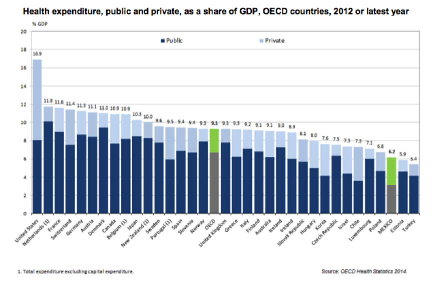 However, a number of challenges stand in the way of effective implementation of universal coverage. First, universal enrolment: while the Ministry of Health claims that full coverage is almost reached, Hector Valle, former general manager for North Latin America at IMS Health argues that “studies carried out by IMS Health, the National Public Health Institute and the National Institute for Statistics and Geography (INEGI) indicate that around 20 percent of the population is still uncovered.” Second, healthcare expenditure. Over the last decade, despite the number of Mexicans enrolled skyrocketing, total expenditure on healthcare increased from 6 percent to just 6.2 percent, well below the average 7.4 percent of other Latin American countries and the 9.3 percent average of OECD countries; on top of this, nearly half is still paid directly by patients. Additionally, the Ministry of Health recently announced a cut of nearly USD 665 million to the health budget, probably a consequence of the steep fall in oil prices, which is forcing many oil-producing countries such as Mexico to review their federal budgets.
