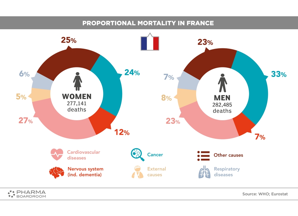 Cancer is the leading cause of death in France, accounting for 28.5% of all deaths in 2014, followed by cardiovascular diseases, which accounted for 25%. However, there are gender differences: 33% of all deaths among men were related to cancer, while this proportion was lower among women (24%).