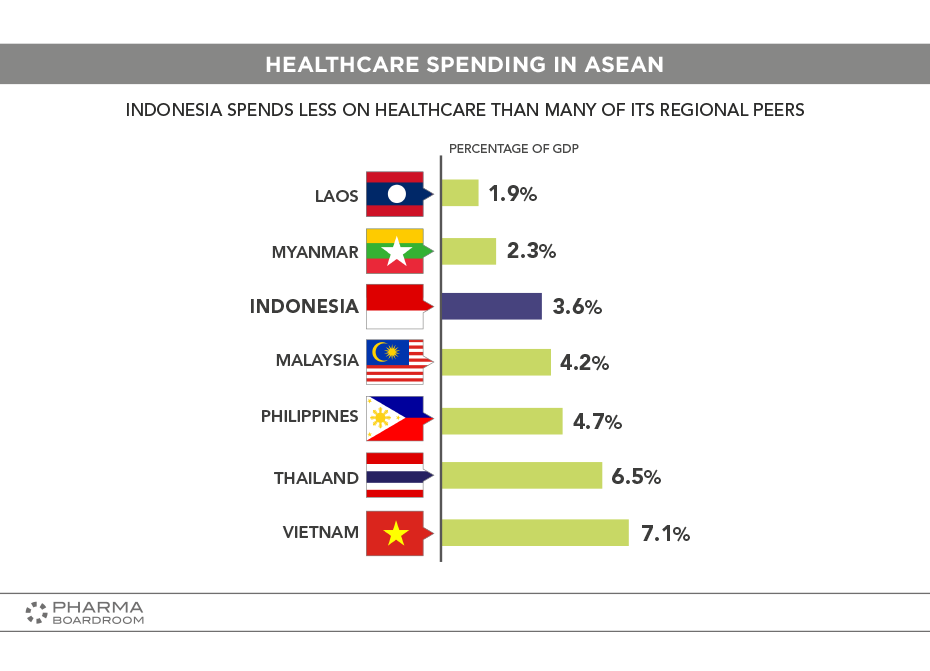 Indonesia spends less on healthcare than many of its regional peers, with only Laos and Myanmar spending a smaller percentage of GDP on healthcare.