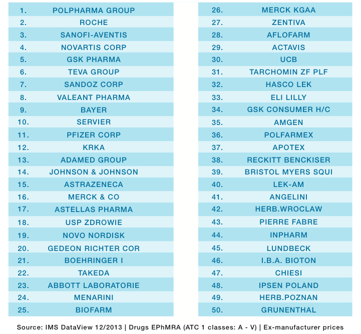 Top 50 ranking of pharma companies in Poland, by sales, 2013