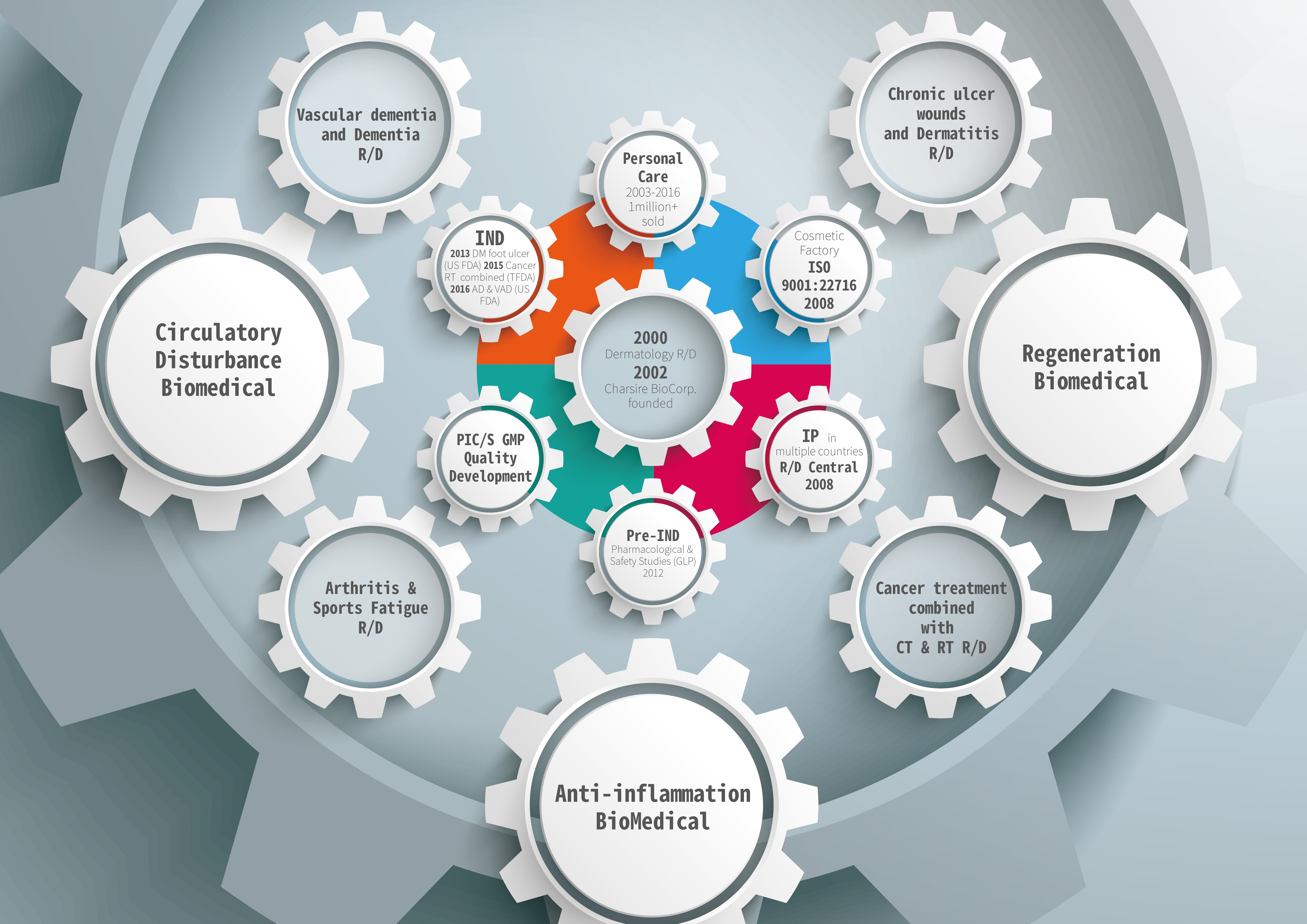 One of Charsire’s cornerstones is its own proprietary technology of natural plants extraction in Cell Regeneration, Anti-Inflammation, and Circulatory Disturbance, which were successfully patented in the US, EU, in Japan and China – among many other countries. Through years of experience in the marketing and sales of our personal care products, Charsire has broadly documented topical transdermal resorption experiences from users and moreover been able to accumulate a very deep understanding of our product’s efficacy on humans, which should not only ensure our R&D strategy is heading to the right direction but also reduce our risk exposure and strengthen our confidence in our products’ capacity to be successful in phase II clinical trials.