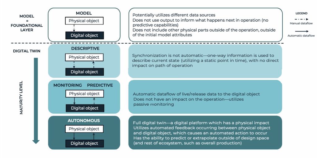 BioPhorum defines a digital twin as a digital replica of a physical asset, synchronised at a specified frequency and fidelity, enabling bidirectional connection to simulate, predict, and inform decisions based on real-world conditions. The novelty of this definition lies in its integration of a maturity model, acknowledging that digital adoption is a spectrum, not an absolute. Importantly, the model aligns with functional tracks, ensuring that the twin capabilities are embedded across the entire value chain.